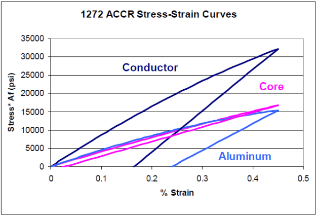 Let's look at an example of a 3M 1272 ACCR Conductor: The violet curve shown represents the steel core of the wire. Its upper curve shows the Initial Curve as stress is gradually applied to the core. The lower violet line shows the core's behavior as the stress is removed. It follows the Final Load Curve for the Core. The light blue curve represents the Aluminum outer wires of the conductor and follows the same logic; except it is easier to see the difference between the Initial and Final Load Curves. The dark blue curves show how the core and outer wires, in their proper proportions, may come together to respond as a unit.