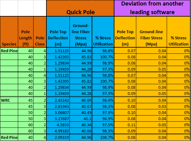 The results for NESC rated poles have the higher Modulus of Elasticity values. Both sets of results track very good. Especially when you note that almost all real pole structures will have some form of support which will limit the range of pole deflection possible. Download the Quick Pole project files you can use to help validate these results yourself.